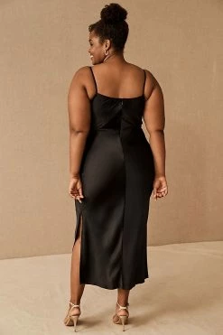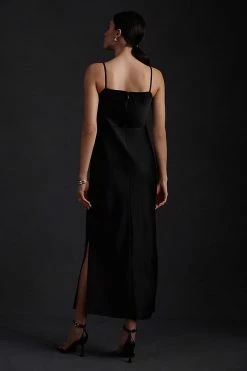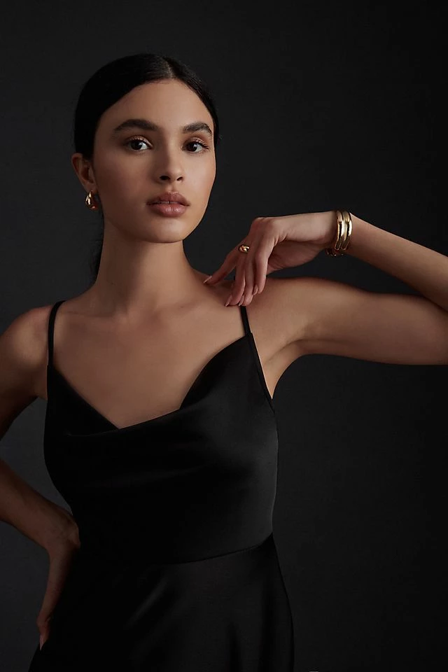 An elegantly draped cowl neckline completes this silky slip dress with a modern midi silhouette.
