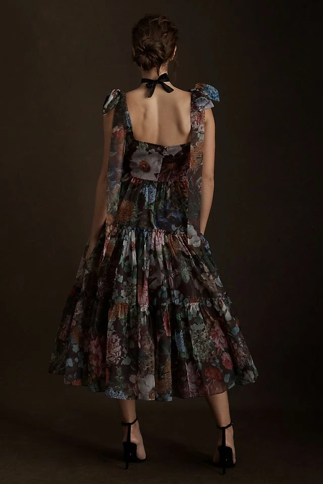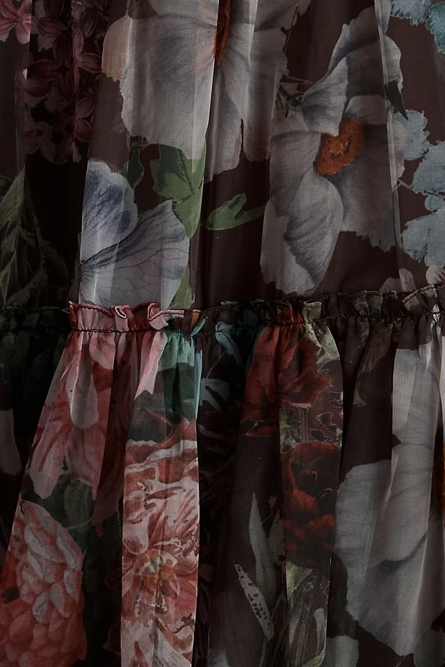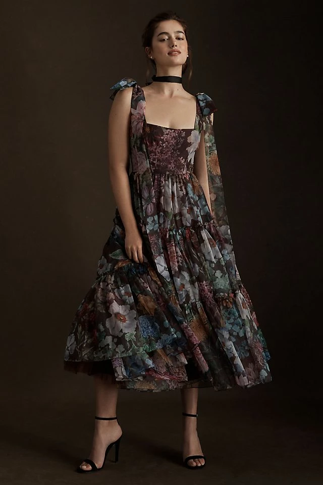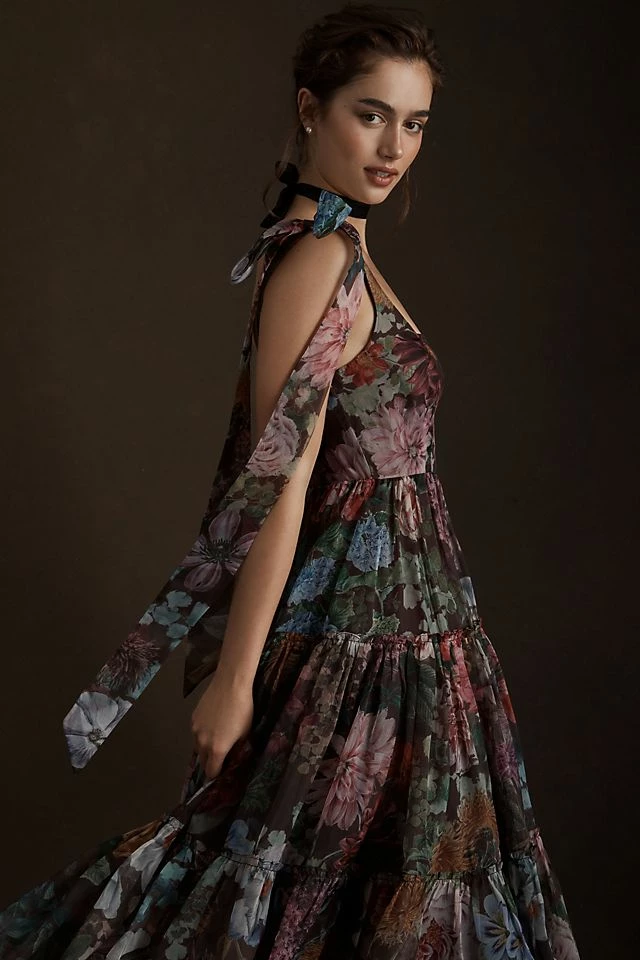 Wander down the garden path in this dramatic style designed exclusively for BHLDN Weddings, featuring bold blooms and an empire waist.