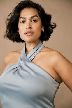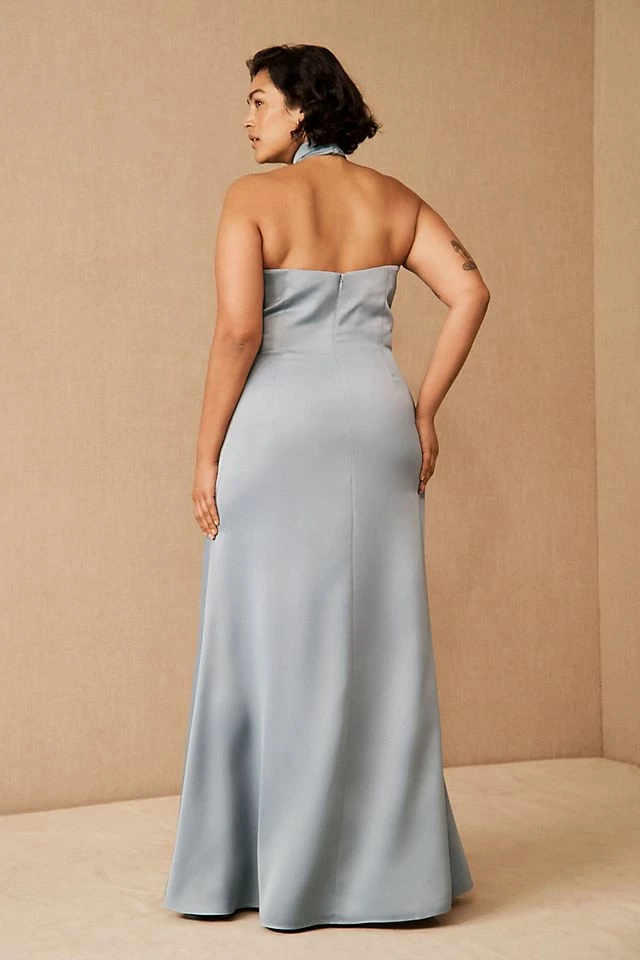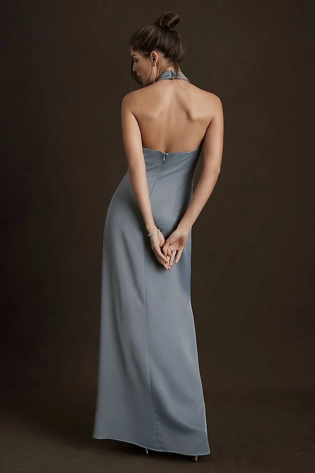 A chic high neckline completes this simply glamorous maxi dress in sleek satin charmeuse.