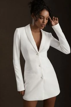 Perfect for the unconventional bride, this modern blazer dress features an open back, plunging neckline, and mini silhouette that’s at once daring and sophisticated.