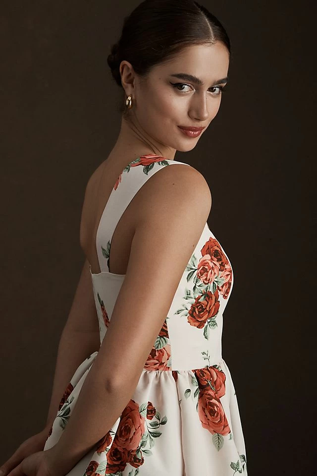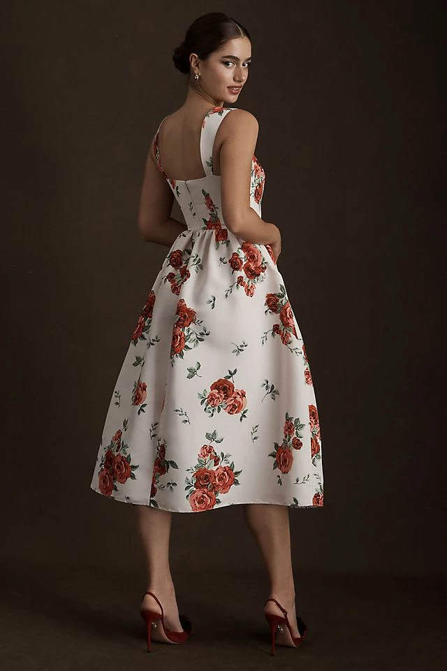 An enchanting silhouette with flattering square neckline, this sweetly subtle dress radiates elegance.