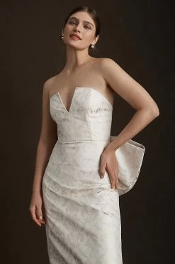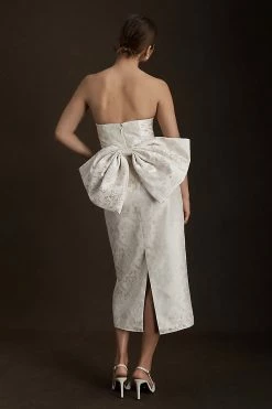 Richly rendered brocade satin, a smart waistline, and a crisp split-v strapless neckline combine to stunning effect, finished with an oversized bow at back.