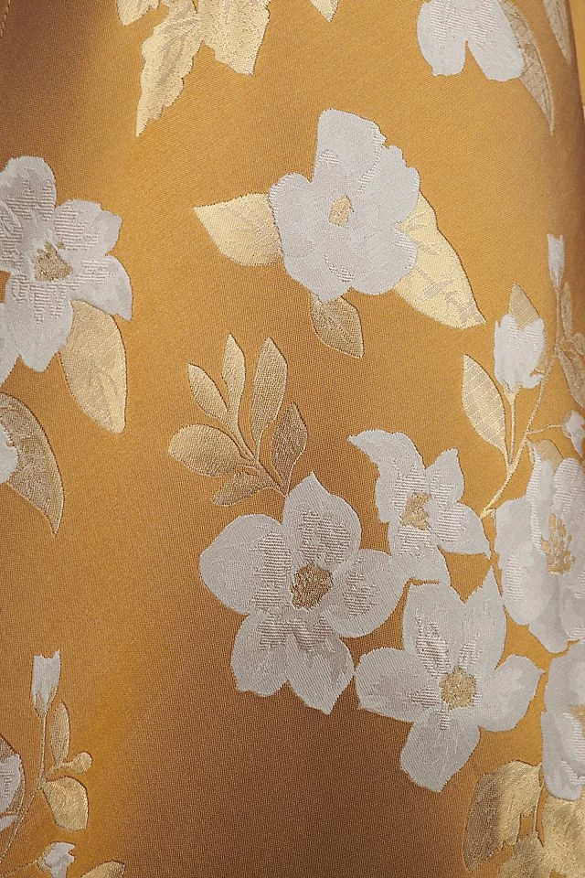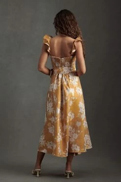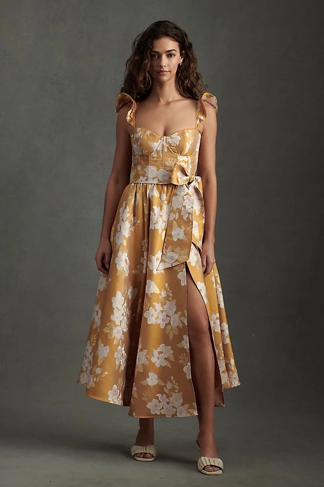 The quintessential fairy-tale dress, a billowing floral skirt flourishes from a vintage-inspired corset bodice. Finished with slight ruffled straps, this maxi silhouette is envisioned in a luxe brocade.